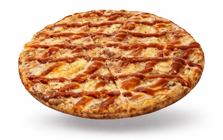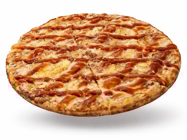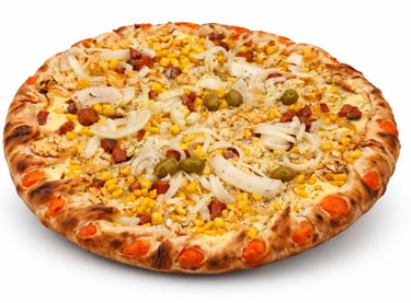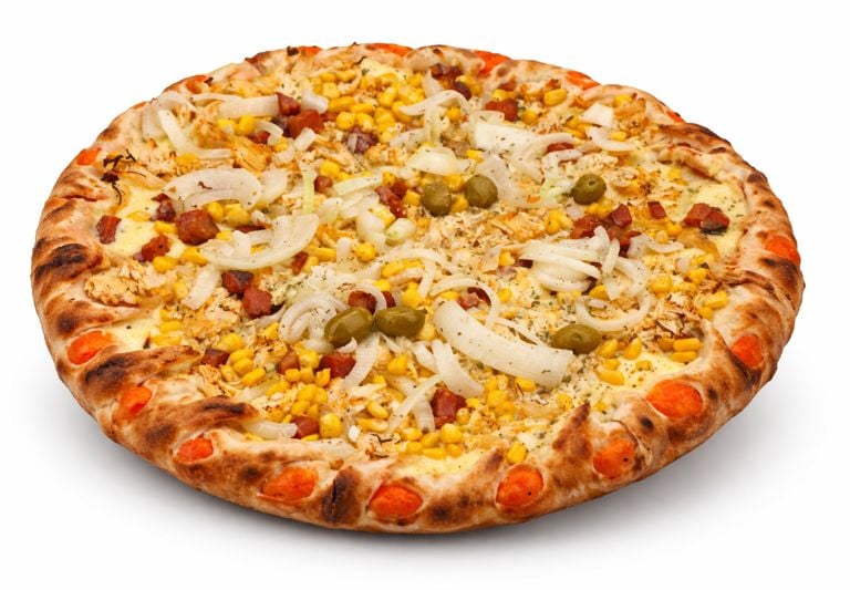 Molho, Mussarela, Frango, Milho, Bacon, Cebola, Azeitona e Orégano.