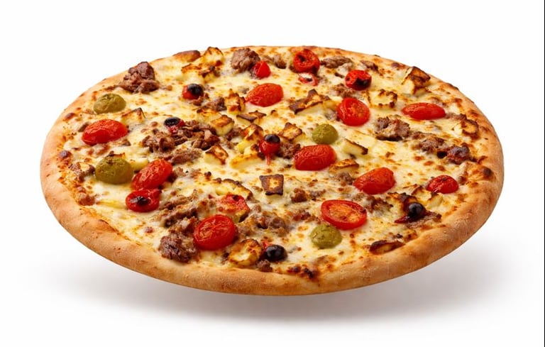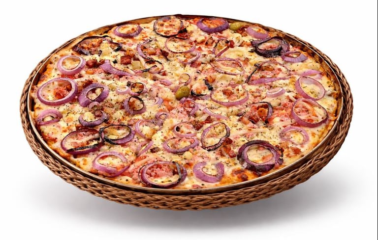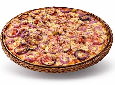 Molho, Mussarela, Presunto, Tomate, Palmito, Bacon, Catupiry, Cebola Roxa, Azeitona Preta e Orégano