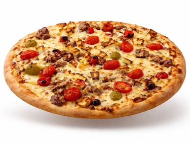 Molho, Mussarela, Atum, Tomate, Cereja, Cebola, Azeitona e Orégano
