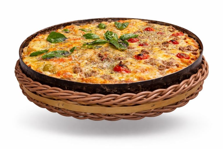 Rolinho de presunto recheado com catupiry original, parmesão ralado e mussarela derretida, sobre molho artezanal, finalizada com azeitonas e orégano.