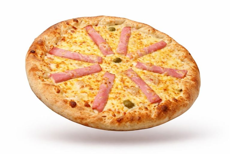 Presunto, bacon dourado, tomate, palmito e requeijão extremamente cremoso, sobre molho e mussarela derretida, com cebola roxa, finalizada com azeitonas e orégano.